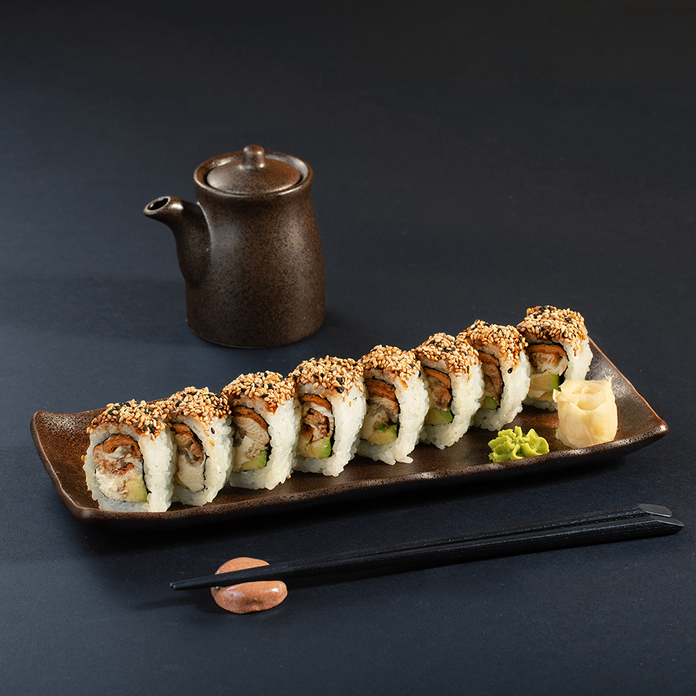 8 Pieces – With Eel, Cream Cheese, Avocado, Inari, Unagi sauce and Sesame.