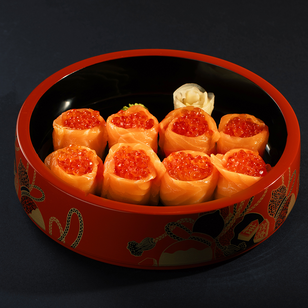 8 ნაჭერი – ორაგულის ხიზილალა, ორაგული, კრევეტები, ყველი და ავოკადო.