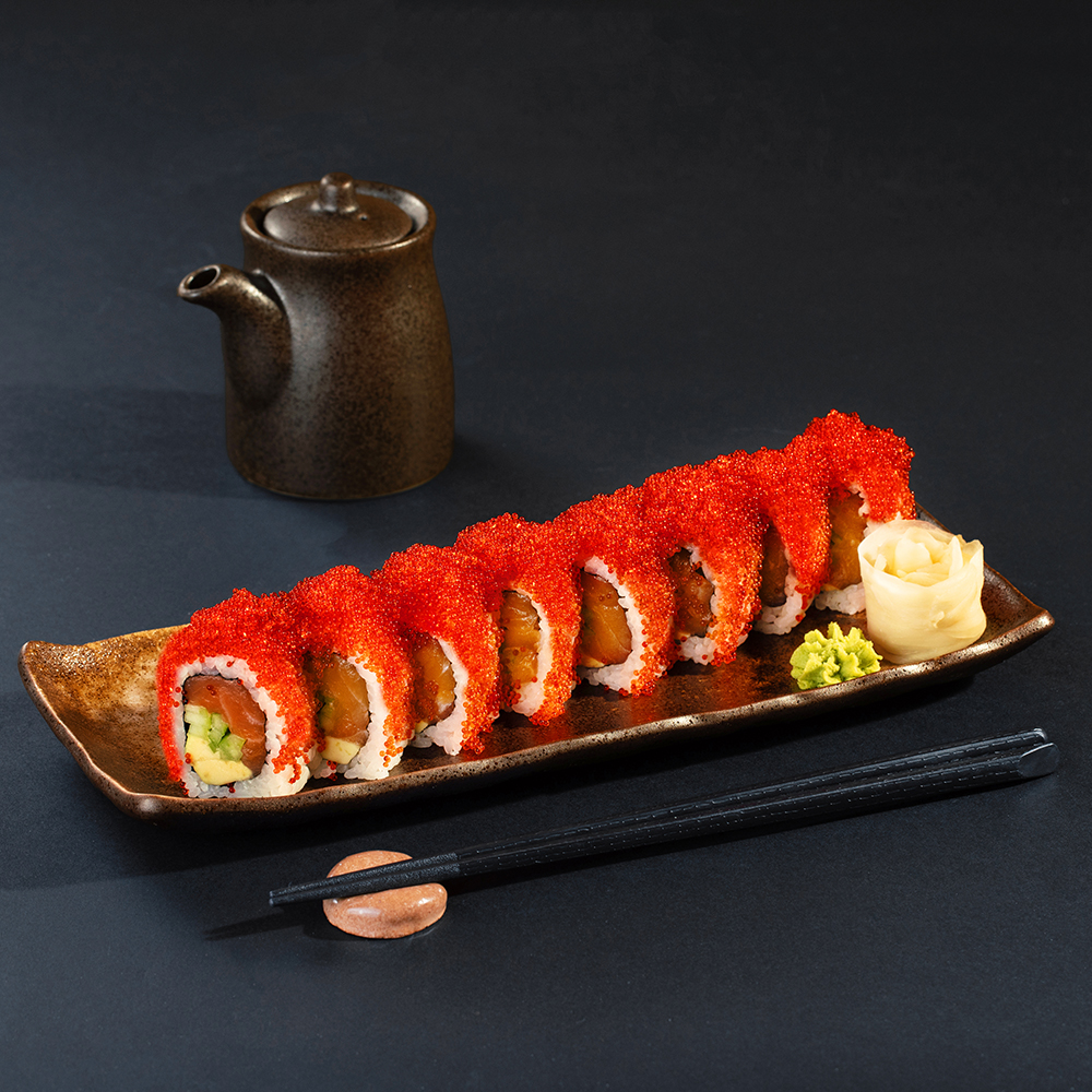 8 ნაჭერი – ორაგული, ავოკადო, კიტრი და ტობიკო (წითელი ან შავი).