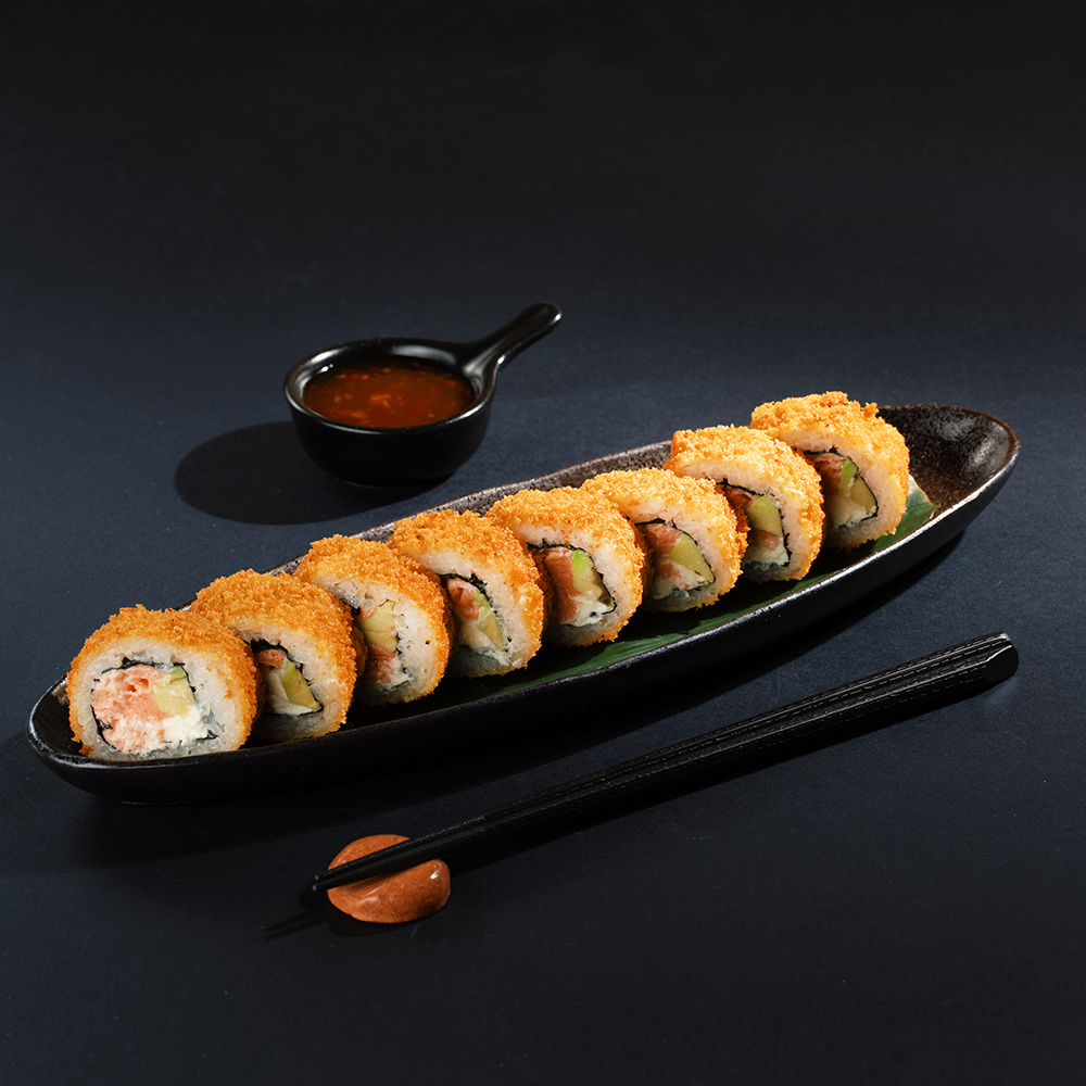 сыр Филадельфия, тобико, фирменный соус, сурими, авокадо, нори, рис, темпура, зеленый лук.