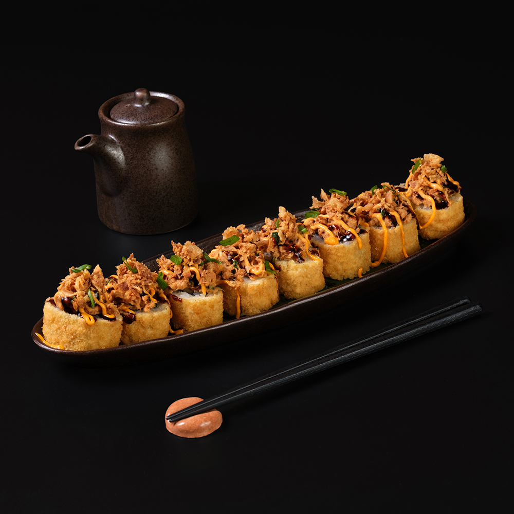фирменный соус, салат из тунца, хрустящая курица, авокадо, нори, рис, темпура, зеленый лук.
